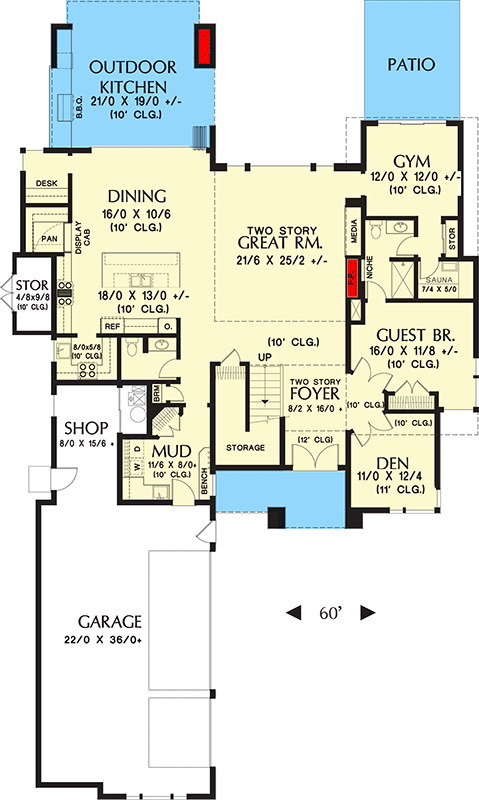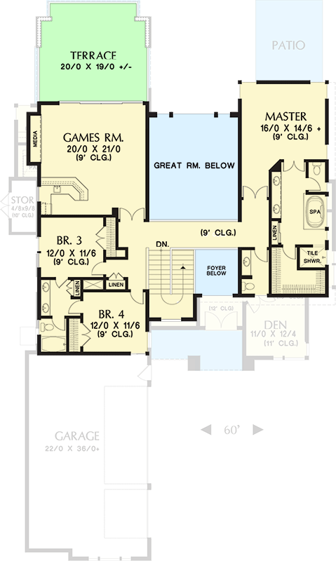 Spanning 4,106 heated square feet, this two-story Transitional home puts the main living areas within easy reach of the kitchen and outdoor spaces. The plan includes 4 bedrooms and 3 full baths and 2 half baths, plus a 3-car attached garage with courtyard entry. The footprint measures roughly 60' 0" wide by 100' 0" deep, with 10' ceilings on the main level.