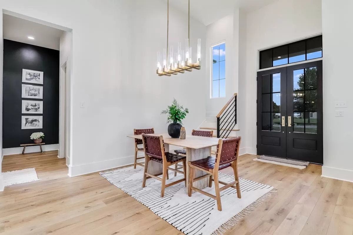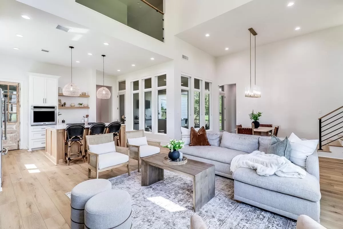 French doors open to the foyer with 19' ceilings which leads into the dining room with views to the outdoor space beyond. The living room to the left has 22'5" vaulted ceilings and a fireplace.