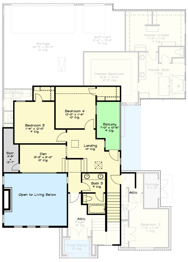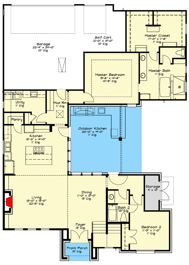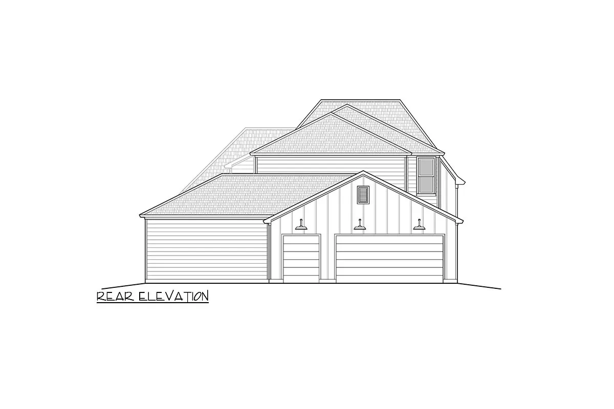 The rear load garage has a single overhead door for two cars and a smaller opening for a golf cart or other smaller wheeled vehicles.