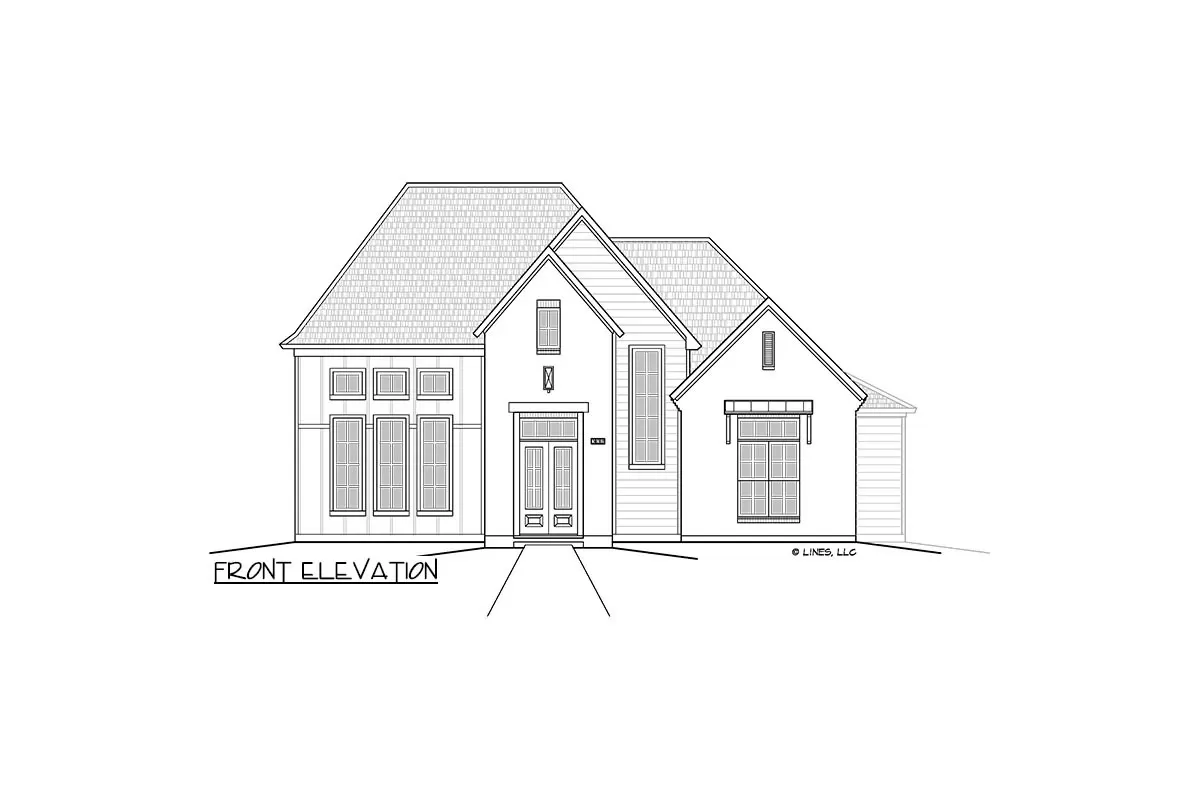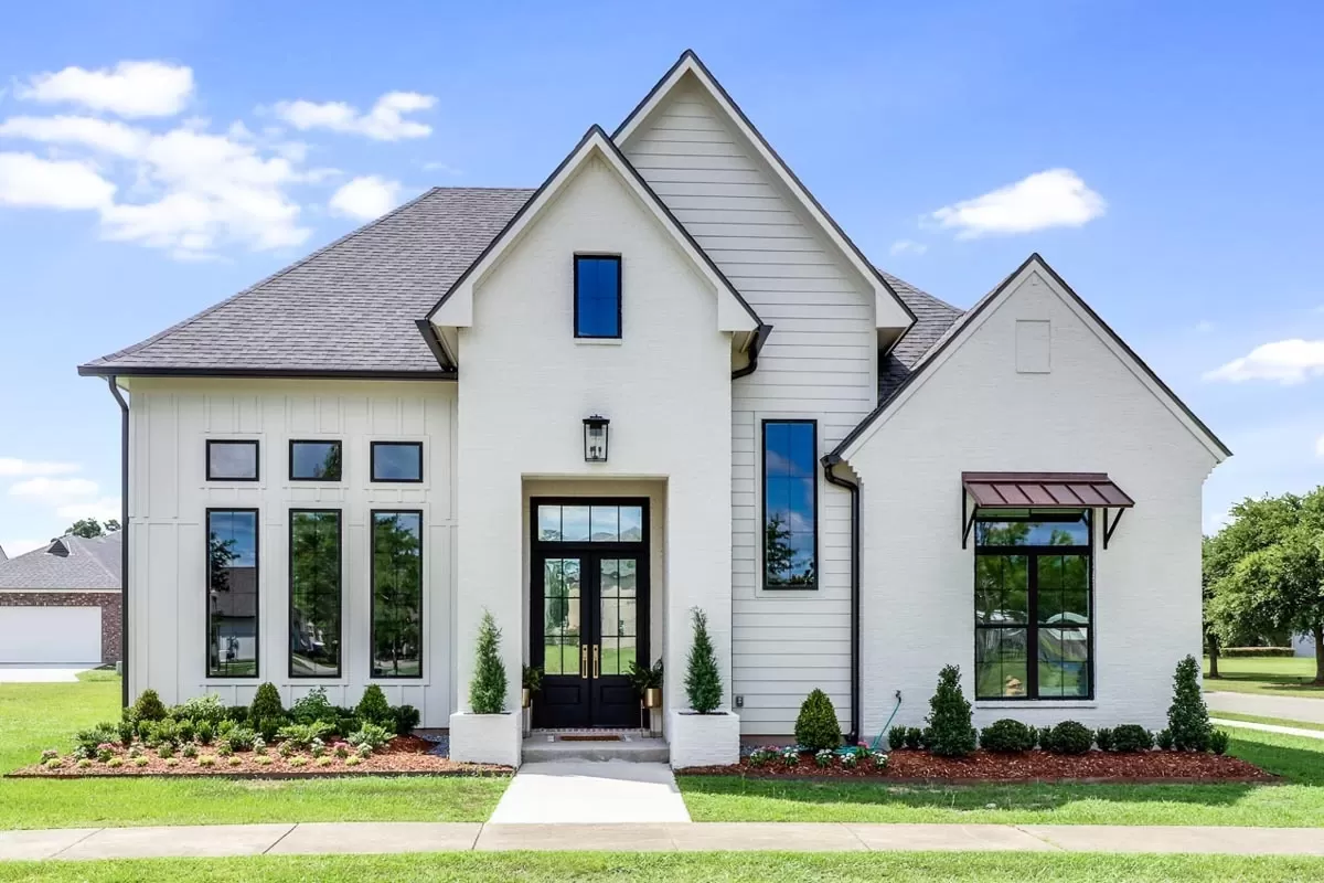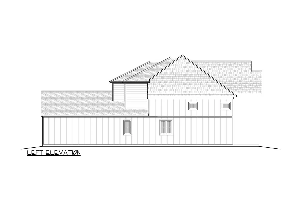 Three tall windows with transoms above to the right of the covered entry add drama and class to this 2,769 square foot house plan with painted brick, board and batten and clapboard siding.