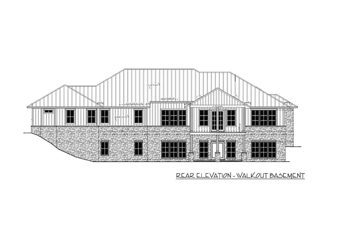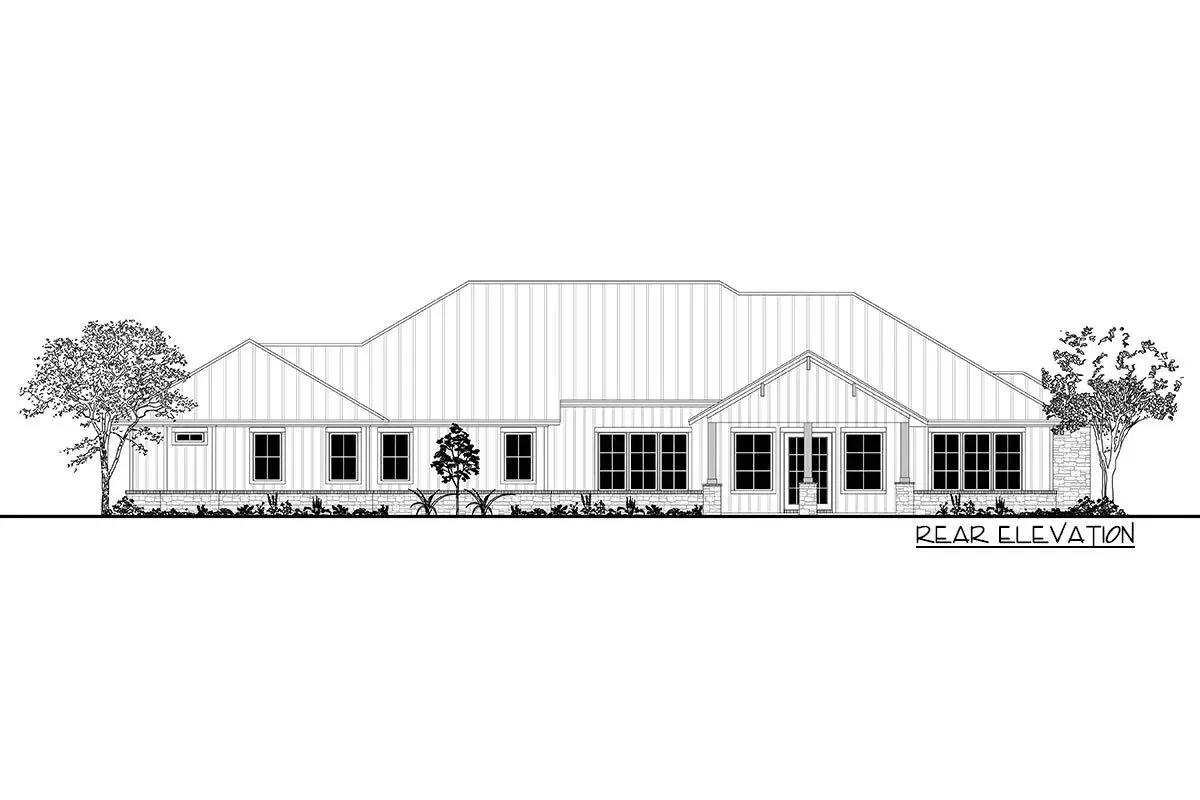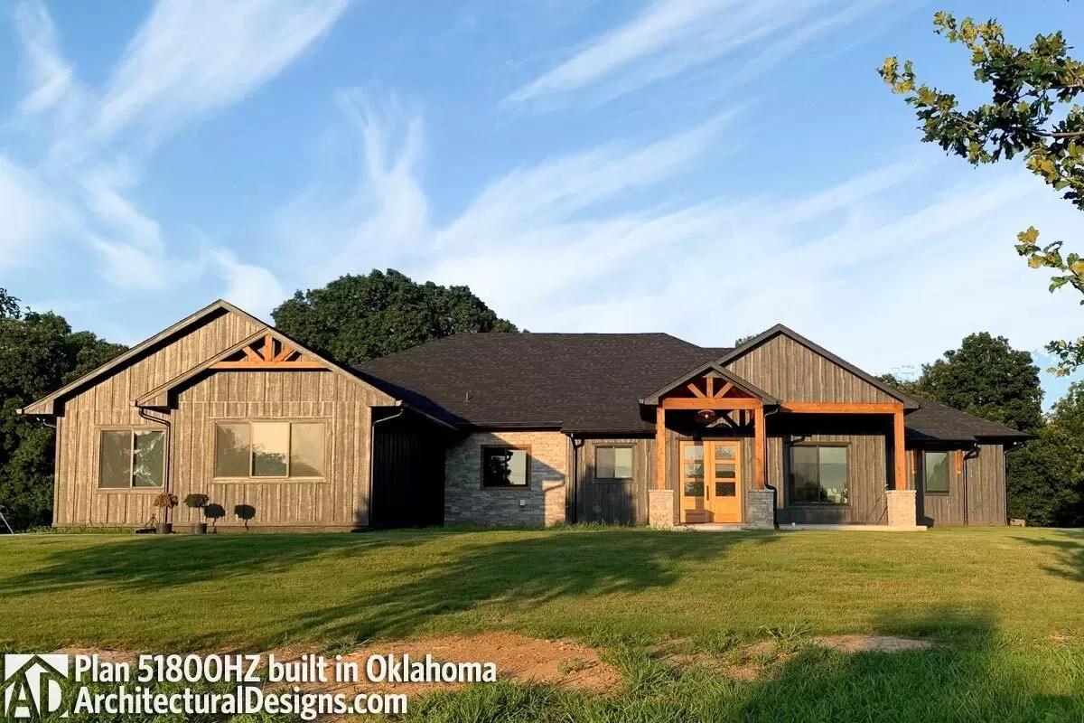 This one-level, hill country home plan proudly delivers a grand curb appeal with a stone trim and timber-frame gable porch, while dark window sashes and a metal roof add a modern edge to the traditional style.