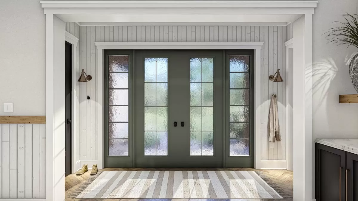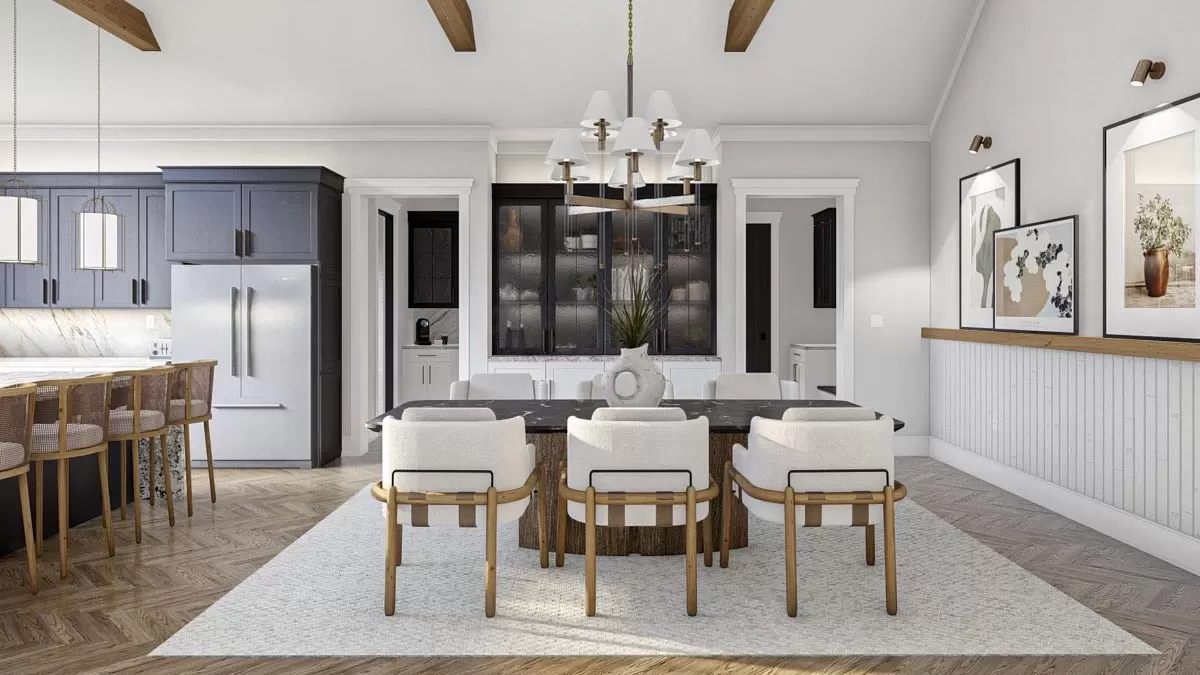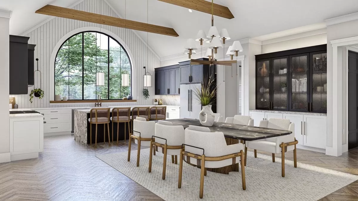 On the inside of this Transitional house plan you will find a large great room with a tray ceiling. The dining room and kitchen are covered by a cathedral ceiling with faux wood beams. The large kitchen sink arched window looks out to the rear of the home, bringing in ample amounts of sunlight. A walk-in pantry and coffee bar are just off the kitchen.
