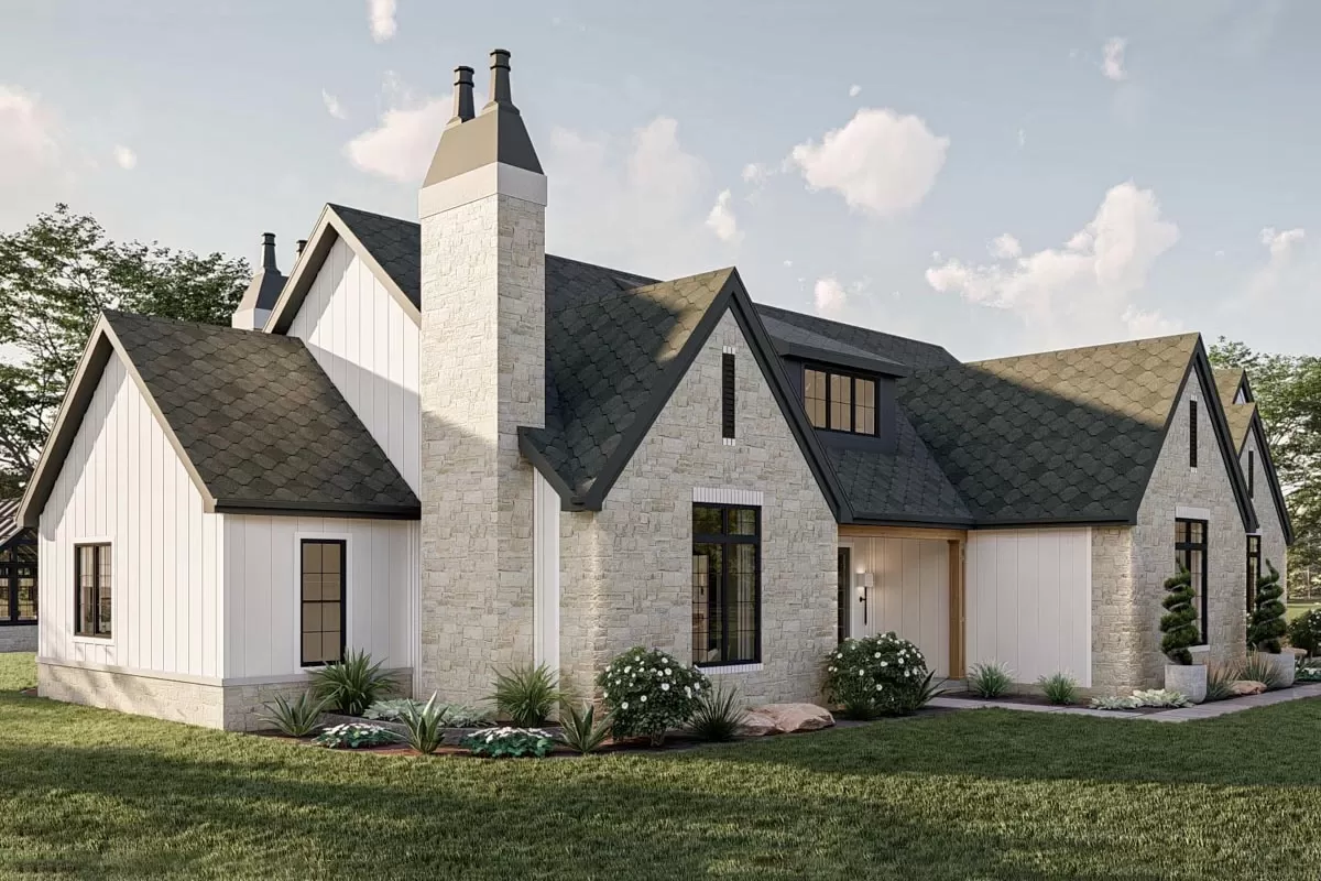 This beautiful 3-Car Modern European Cottage style house plan. The steep pitches, short gable overhangs, and wood accents give this home amazing curb appeal.