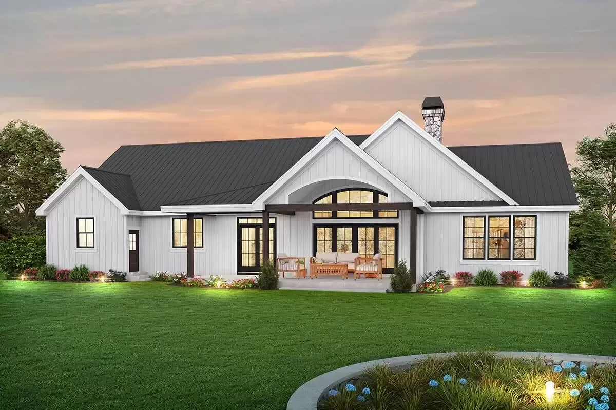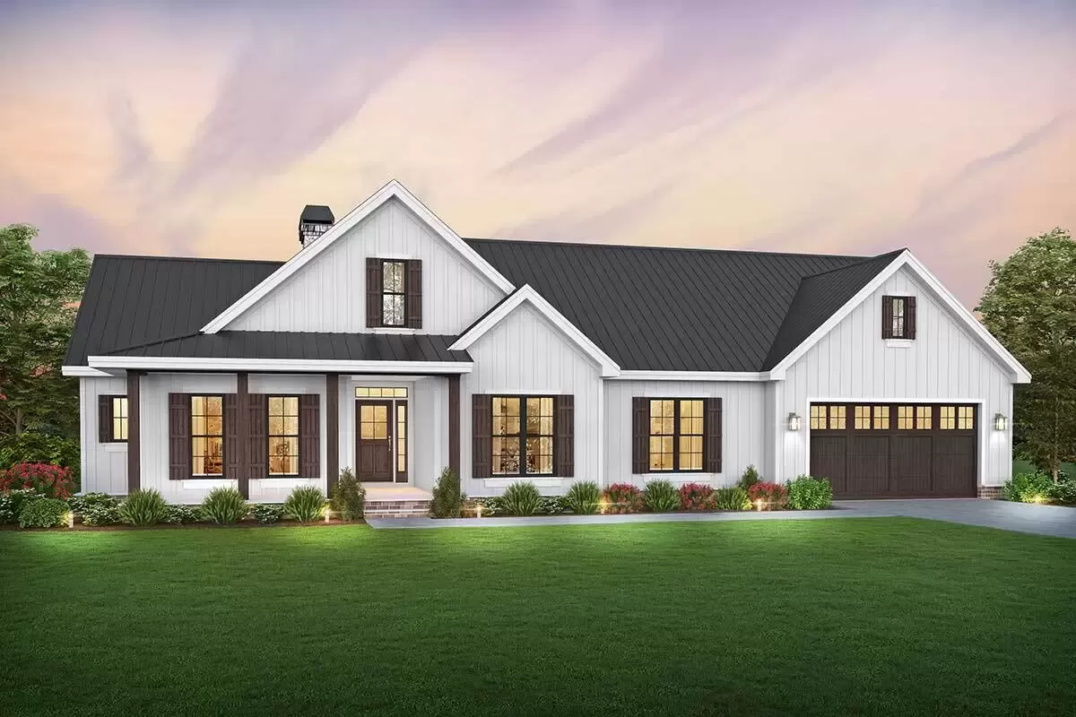 Board and batten siding paired with the shutters and front porch give this one-story house plan a contemporary vibe.
