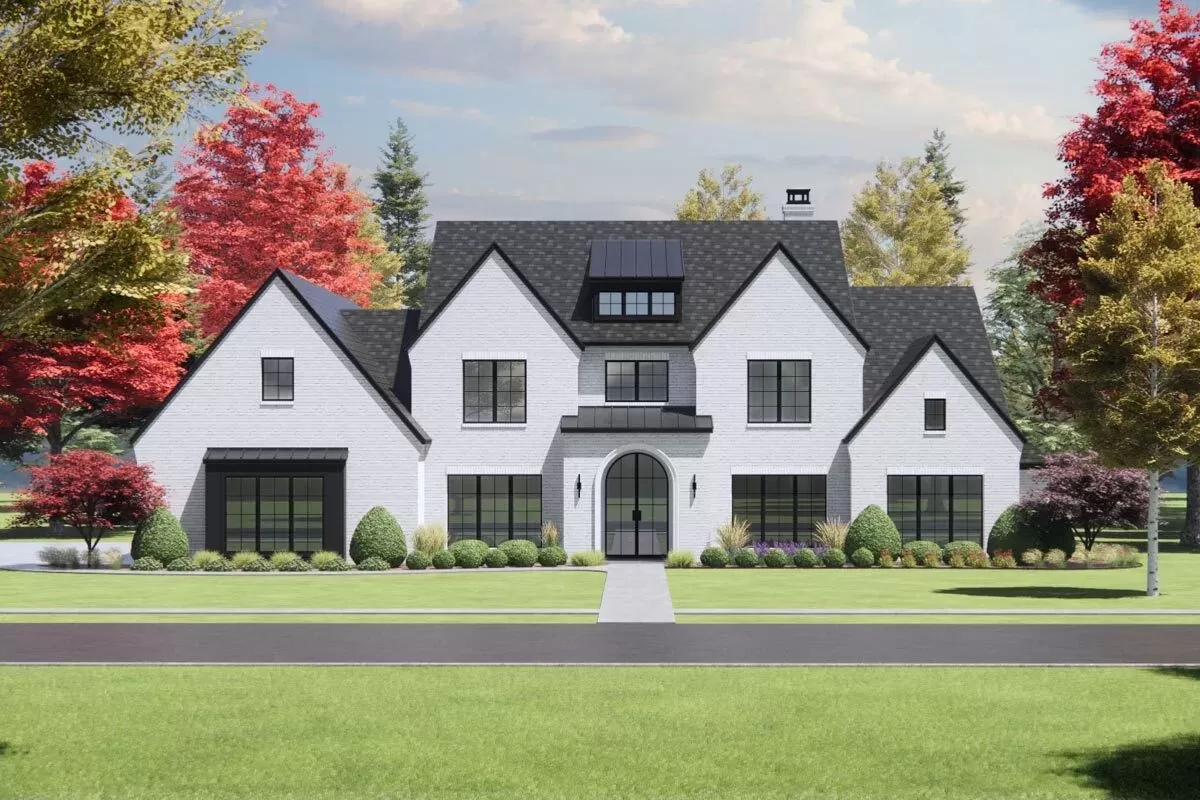 This 2-story Transitional house plan gives you 4 beds, 4.5 baths and 5,498 square feet of heated living set behind a beautiful pained brick exterior. A curved arch atop the covered entry along with metal roof accents and a shed dormer add to the curb appeal.